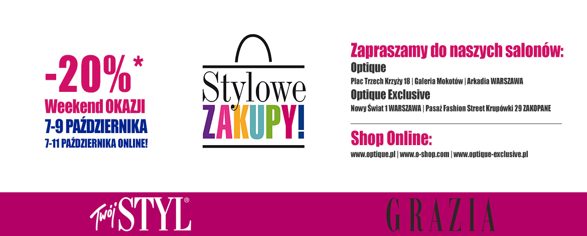 - Promocja obowiązuje w stacjonarnych salonach optycznych Optique: Pl. Trzech Krzyży 18, Galeria Mokotów, ul. Wołoska 12, Arkadia Al. Jana Pawła II 82, Optique Exclusive: ul. Nowy Świat 1 Warszawa i Pasaż Fashion Street Krupówki 29 Zakopane, jak również w sklepach internetowych www.optique.pl, www.o-shop.com i www.optique-exclusive.pl