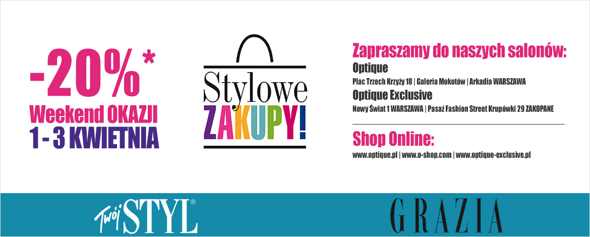 - Promocja obowiązuje w  stacjonarnych salonach optycznych Optique: Pl. Trzech Krzyży 18, Galeria Mokotów, ul. Wołoska 12, Arkadia Al. Jana Pawła II 82, Optique Exclusive: ul. Nowy Świat 1 Warszawa i Pasaż Fashion Street Krupówki 29 Zakopane, jak również w sklepach internetowych www.optique.pl, www.o-shop.com i www.optique-exclusive.pl.