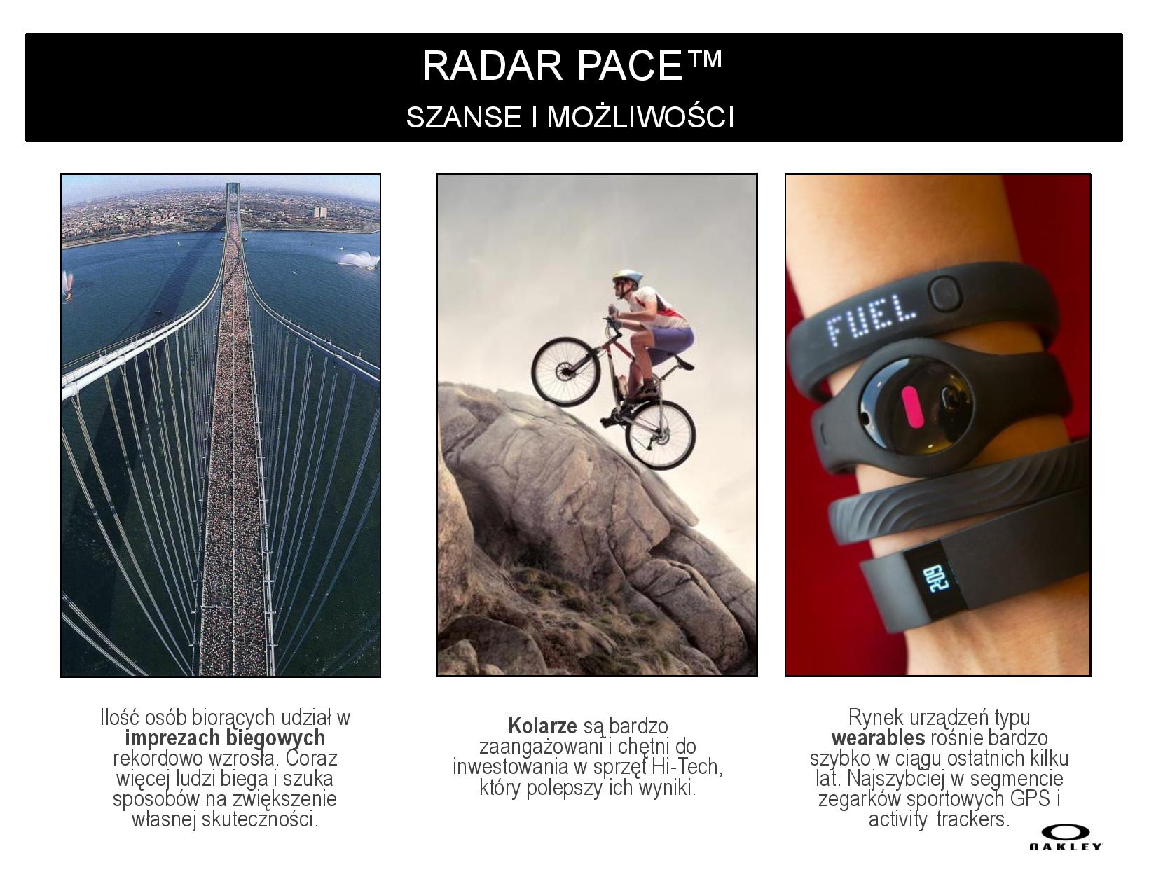 Oakley Radar Pace™ to inteligentne okulary, które posiadają system treningowy aktywowany głosem w czasie rzeczywistym. Poszukiwanie nowych sposobów na przedefiniowanie tego w jaki sposób sportowcy trenują doprowadziło do powstania modelu Radar Pace™.Jest on wynikiem wielu lat badań, rozwoju i współpracy dwóch firm: Oakley oraz Intel. Łącząc sportową estetykę marki Oakley i doświadczenie technologiczne Intela, Radar Pace™ jest prawdziwie innowacyjnym i spersonalizowanym narzędziem treningowym dla sportowców na wszystkich poziomach zaawansowania. Oakley i Intel połączyły siły aby stworzyć produkt, który nie tylko wspiera podczas ćwiczeń, ale też wyposaża sportowca w bogactwo informacji i feedback w czasie rzeczywistym.