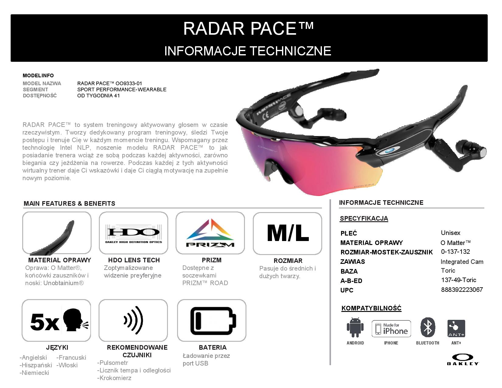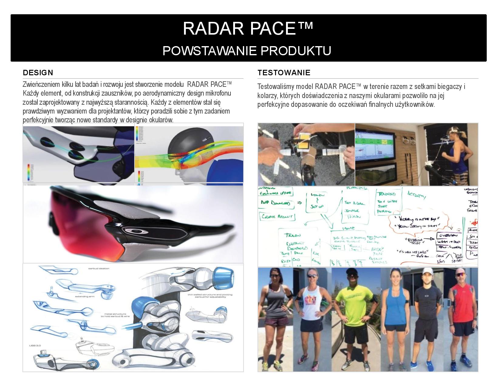Radar Pace™ to prawdziwie innowacyjny produkt, który łączy w sobie technologię Intel z dynamicznym i lekkim designem Oakley cenionym przez sportowców na całym świecie. Okulary te wyposażone są również w soczewki z rewolucyjną technologią Prizm, która w dramatyczny sposób zmienia sposób widzenia detali, kolorów i kontrastów. Radar Pace™ składa się z dwóch podstawowych elementów: okularów Oakley z wbudowanymi słuchawkami i mikrofonem oraz aplikacji mobilnej na iOS i Android.