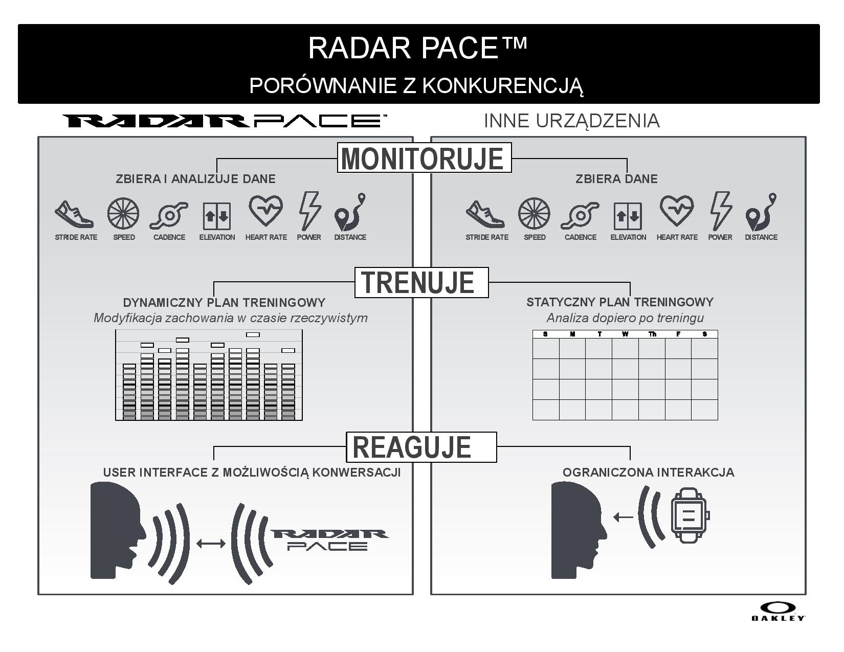 Podobnie jak w przypadku prawdziwego trenera, Radar Pace™ tworzy dynamiczne i spersonalizowane programy treningowe i wspiera sportowców, szczególnie biegaczy i rowerzystów, na każdym etapie ich treningu. Dzięki inteligentnej technologii i dedykowanej aplikacji Radar Pace, zbiera i analizuje dane dotyczące wydajności, w tym tętna, prędkości, kadencji, czasu, tempa i dystansu. Dostarczając spersonalizowane instrukcje stworzone na bazie otrzymanych wyników, okulary te świetnie motywują sportowców i zmieniają ich sposób myślenia o możliwościach monitorowania i zmiany własnych wyników.