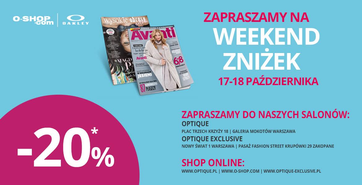 - Promocja obowiązuje w  stacjonarnych salonach optycznych Optique Pl. Trzech Krzyży 18, Optique Galeria Mokotów, ul. Wołoska 12, Optique Exclusive ul. Nowy Świat 1 Warszawa i Optique Exclusive Krupówki 29 Zakopane, jak również w sklepach internetowych www.optique.pl, www.o-shop.com i www.optique-exclusive.pl.